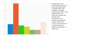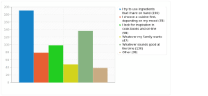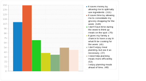 The next question only popped up for those people who answered “No” to the above question. It simply asks, “What’s preventing you from planning meals in advance?” The obvious trend in the answers (as well as those who typed in their own response) is that people just don’t think about it. After reading these answers, I get the feeling that these people live alone and cook for only themselves. I’ve made this conclusion purely due to the first person singular viewpoint in the responses (“when *I* eat” or “when *I* shop.”) Hopefully I can play around with these data more in Excel and try to confirm this conclusion. Needless to say, people who don’t plan meals in advance simply don’t want to; they figure out what they’re in the mood for right now, or by what looks good at the store, or just blatant procrastination. There was a lot of references to “feel like” and “mood” in the responses. Apparently, people aren’t military generals driven by a strict schedule. “0700 Hours – WAFFLES, PEOPLE!”