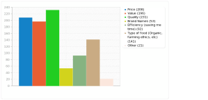When asked what factors people consider while grocery shopping, 71% said price, 67% included value, and 79% checked the box for quality. Very few people (18%) cared about brand names. Almost half mentioned they look for organic food, care about farming ethics, etc. I’m actually quite interested in this concept, and plan to write a more protracted summary of these thoughts in a future blog post.