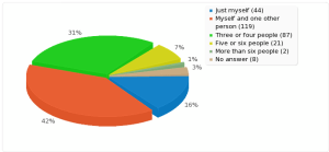 In total, I got 276 full responses to the survey, and another 15 partial responses. While this is far from my initial target of 1,000 responses (which apparently requires incentives I just can’t produce at this time,) I think the data show a fair sample of the “techie” family types that are liable to try out a product such as KitchenPC. So, what types of cooks answered the survey? Only 8 would identify themselves as “gourmet” cooks. 57 rate themselves as an accomplished cook, and 154 (a little over half) are comfortable with the “home cook” label. 33 are aspiring, and 31 say they need help. While these are simply labels that one assigns to themselves with no common denotation, the summary I can extract from this question is that I can be fairly comfortable trying to target the average home cook, which is nice because that’s what I consider myself. One can also raise the valid point that the people who took my survey are not necessarily who will end up using the product. Maybe I’ll attract gourmet cooks from all around the world on day one, and end up with full page adverts in “Gourmet Cooks Monthly.” However, the strategies I used for finding survey respondents will be similar to those I employ to find beta users, so I predict a similar demographic for initial users.