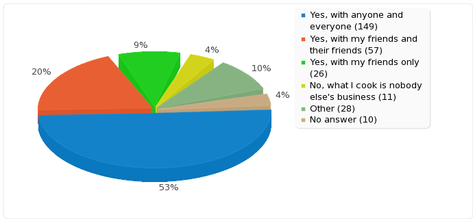 The last question was geared around privacy, as the original prototype had a lot of social networking features that unfortunately will not make it into the public beta. Never-the-less, it’s interesting information. “Would you be willing to share what recipes you cook with others?” This was a rather poorly worded question, but what it means is do you care about people seeing your calendar. 53% say “Yes, with anyone and everyone.” 20% say they’ll share this information with their friends and friends of friends, 9% saying friends only, and only 4% fear big brother watching and wouldn’t be comfortable letting anyone know what goes on in their kitchen. It’s pretty easy to see that privacy won’t really be a huge concern, however the post-beta version of KitchenPC with social features will definitely include some basic privacy controls.