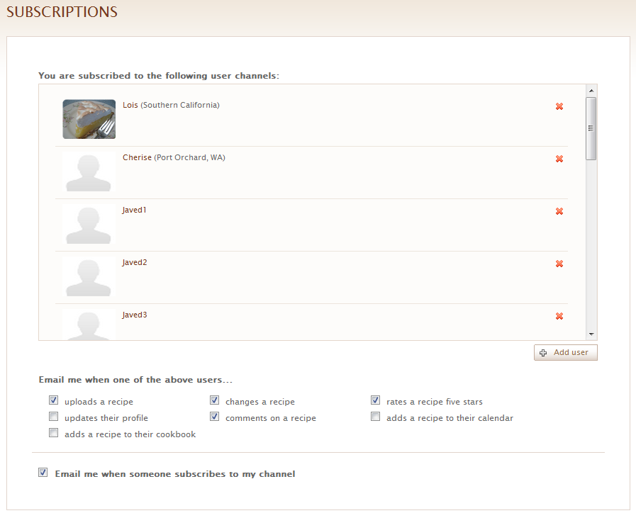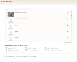 This initial implementation contains two new web pages on the site. First, users can control their subscriptions and notification preferences on a single page by clicking the “Subscriptions” link on the top of any page. This page shows users who they’re currently subscribed to and allows the user to add a new subscription or remove an existing one. The popup User Viewer was also modified to allow users to subscribe to someone directly when they click on a username throughout the site. The Subscriptions page also contains check boxes to set preferences as to which email notifications users want to receive.