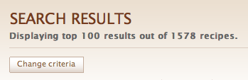 One of the comments from the UserTesting.com video was that my site doesn’t contain enough recipes. While this is probably a valid opinion, I believe the impression the tester got was skewed due to my search result limitations. I limit the results of any query to 100 recipes so as not to generate too much HTML or too much data being serialized across the wire. While the ideal solution is to implement paging, this seemed not necessary for an MVP as most users never bother searching past the first page of a search engine. I figured they can just narrow down their search criteria easier than digging through 100 recipes to find what they’re looking for. The drawback of this approach was exemplified when the user commented that my site apparently only has 100 chicken recipes, when in fact I have easily fifteen times that amount. The fix was to publicize the actual database count of the query, while making it clear to the user that only the first 100 matches are being displayed.