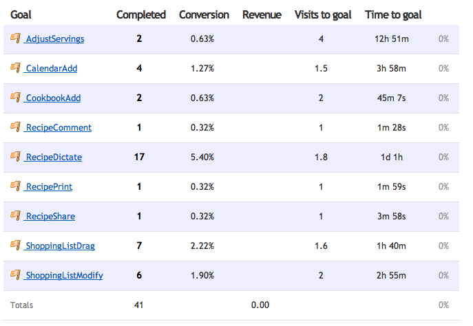 In addition to that, Clicky provides a feature called “Goals”. A goal is something you want users to do, such as using a site feature or purchasing an item online. You can log a goal with a simple JavaScript call to “clicky.goal()” and pass in a goal name. These goals will appear at the top of each session, and you can get stats on each goal such as what percentage of your users reached that goal, and the average time it takes a user to do so. I’ve set goals for various KitchenPC features such as dragging a recipe to the shopping list, adding a recipe to the calendar, subscribing to another user, adding a recipe to their cookbook, adjusting the serving size on a recipe, and more. Though I can mine some of this data from my own database, I now have a graphical overview that’s much easier to work with. Plus, now I can really show how users are using my features (eg, do they use drag and drop or click the “Add” button?)